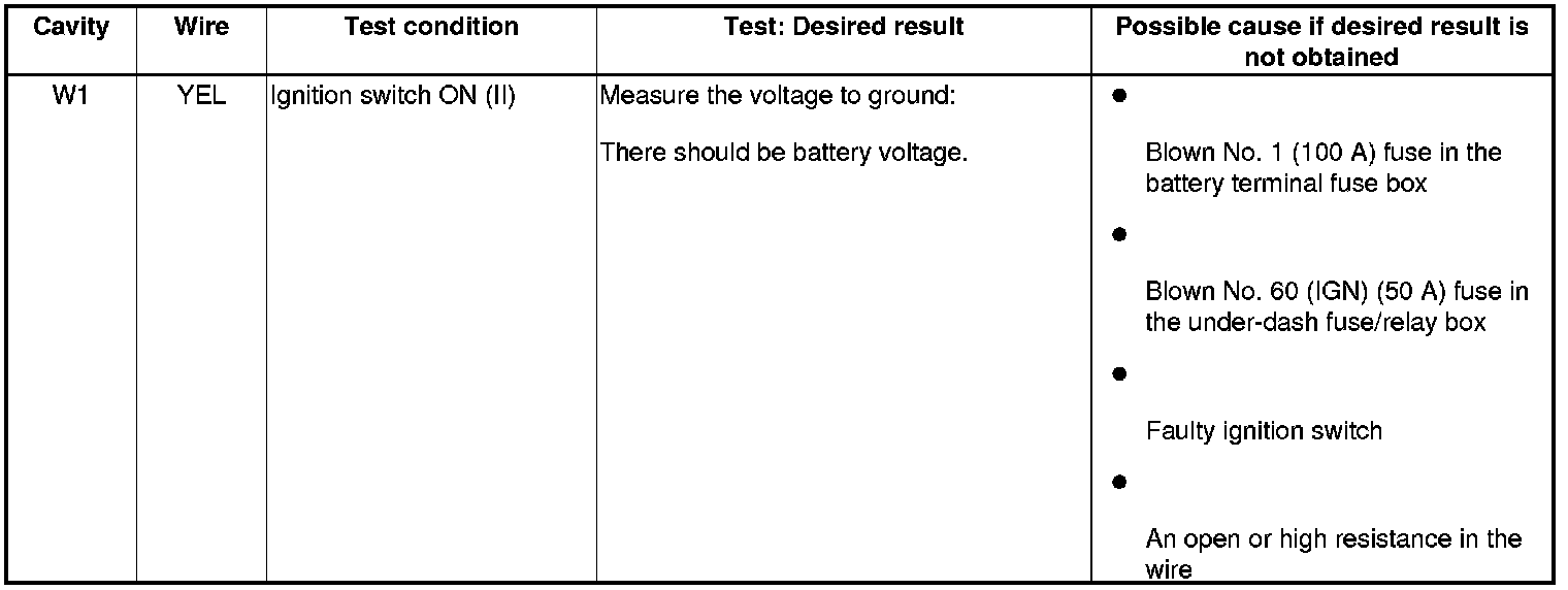 - Before testing, check the No. 1 (10 A), No. 20 (15 A), No. 22 (7.5 A), No. 27 (30 A), No. 35 (10 A), No. 36 (15 A), No. 38 (15A), No. 49 (15 A), No. 50 (15 A), and No. 60 (50 A) fuses in the under-dash fuse/relay box.