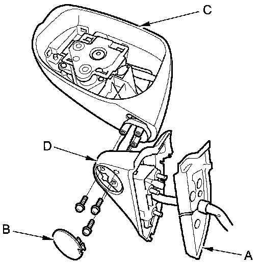 5. Remove the three screws, and separate the mirror housing (C) from the bracket (D).