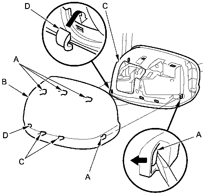 3. Release the hooks (C, D), then remove the mirror housing cover.