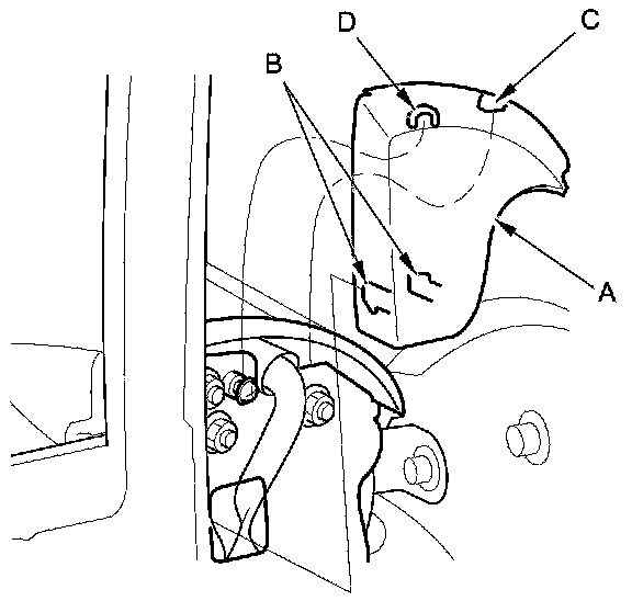 1. Carefully pull the bottom edge of the mirror mount cover (A) out to release the lower hooks (B), and remove the cover by lifting it upward to release the upper hooks (C, D).