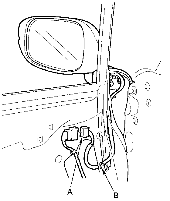 6. Remove the mirror (A) by pulling the threaded studs (B), the screw (C), and the wire harness (D) out through the holes in the door. Take care not to scratch the door or the mirror.