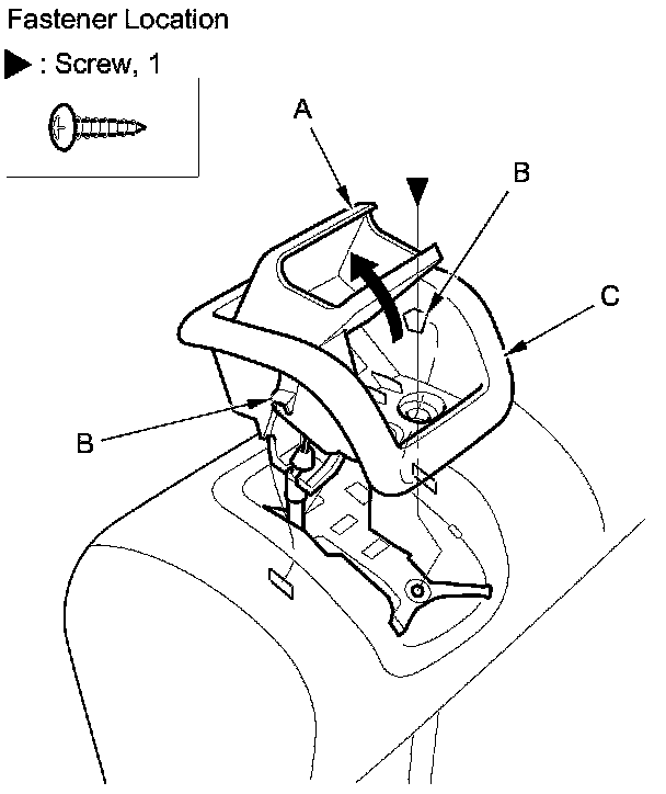 2. Release the hooks (B), and pull up the latch cover (C) from the rear seat-back.