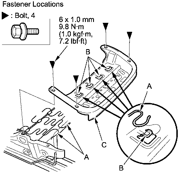 4. If necessary, remove the bolts, and release the seat cushion springs (A) from the hooks (B), then remove the seat cushion frame (C).