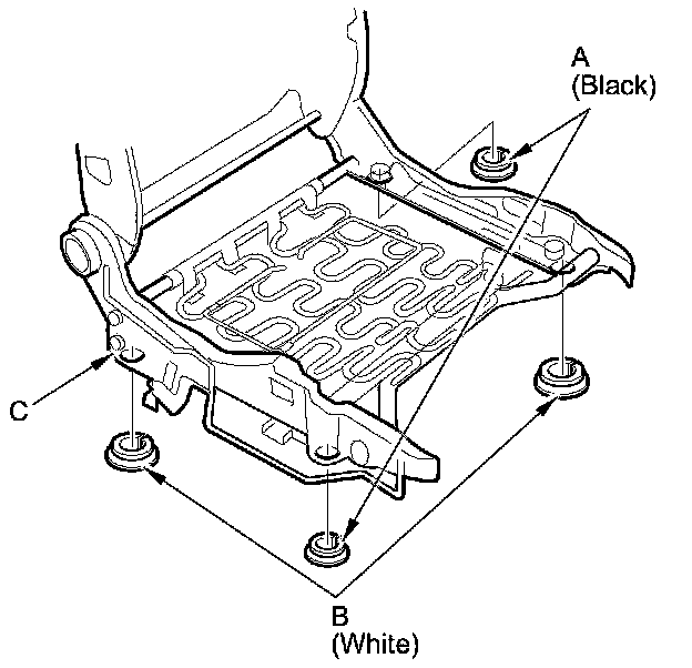6. If necessary, remove the bushings (A, B) from the seat cushion frame (C).