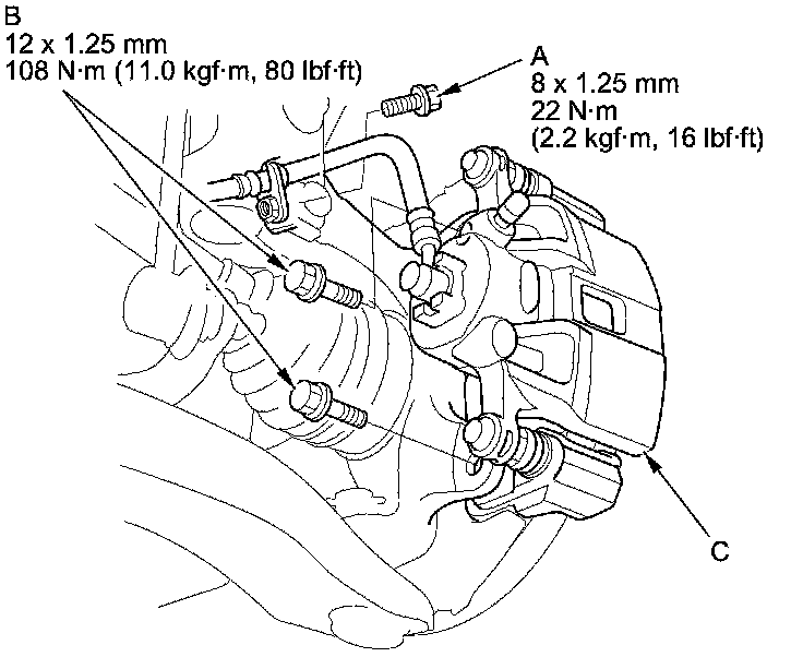 4. Remove the brake caliper bracket mounting bolts (B), then remove the caliper assembly (C) from the knuckle. To prevent damage to the caliper assembly or the brake hose, use a short piece of wire to hang the caliper assembly from the undercarriage. Do not twist the brake hose excessively.