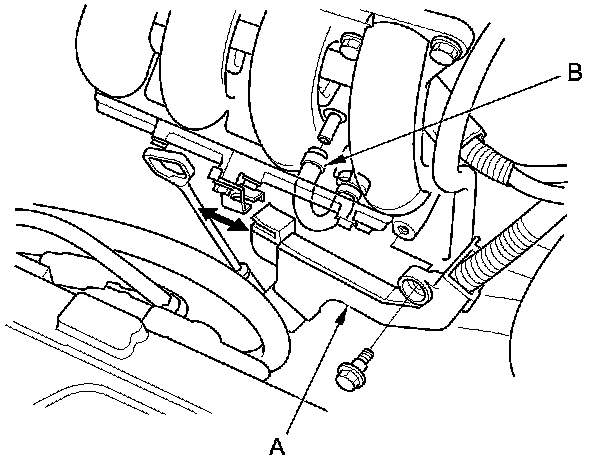 3. Loosen the intake manifold mounting bracket bolts (A, B), then loosely install the intake manifold mounting bracket bolts (C, D).