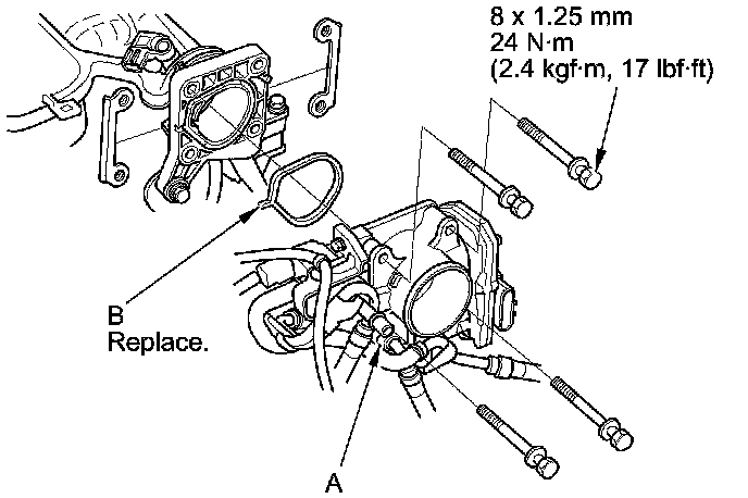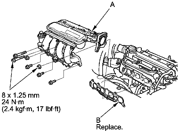 2. Install the intake manifold/chamber assembly (A) with a new gasket (B).
