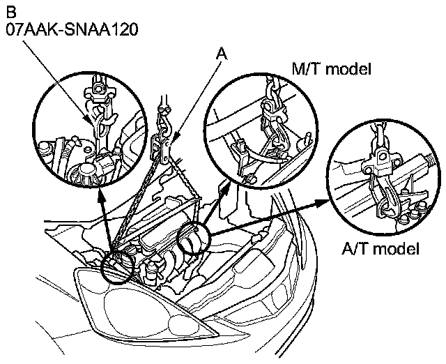 Be sure that they are properly aligned. Carefully lower the vehicle until the engine/transmission are properly positioned in the engine compartment. Make sure the vehicle is not resting on any part of the engine/transmission. Support the engine/transmission with a chain hoist (A) and carefully raise the engine/transmission into place.