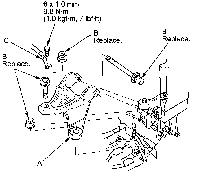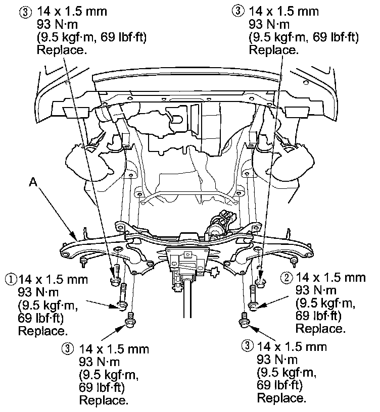 13. Install the front subframe (A), then loosely install the new front subframe mounting bolts.