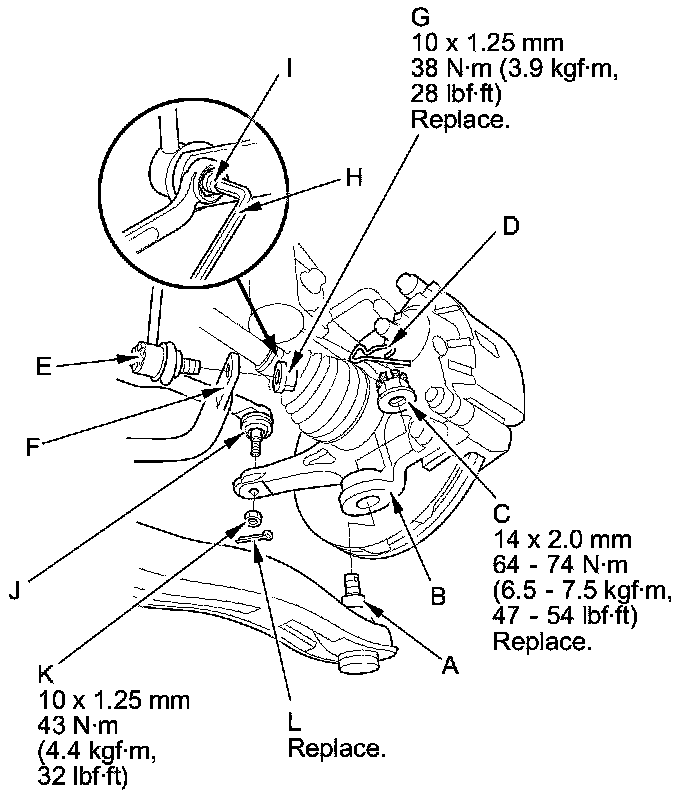 31. Install the tie-rod end ball joint (J) to the each knuckle with the nuts (K) and new cotter pins (L).
