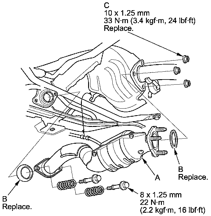 35. Install the under-floor TWC (A) using new gaskets (B) and new self-locking nuts (C).