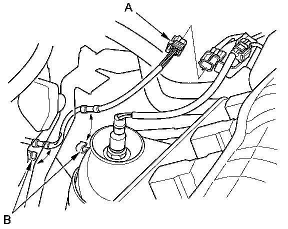 42. Connect the secondary HO2S connector (A), then install the secondary HO2S harness to the clamps (B).