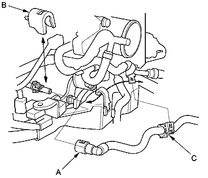 43. Connect the fuel feed hose (A) Fuel Line/Quick-Connect Fitting Installation, then install the quick-connect fitting cover (B) and the fuel feed hose clamp (C).