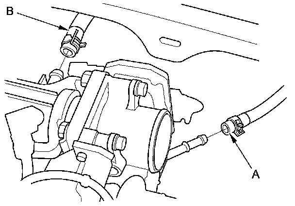 44. Connect the EVAP canister hose (A) and brake booster vacuum hose (B).