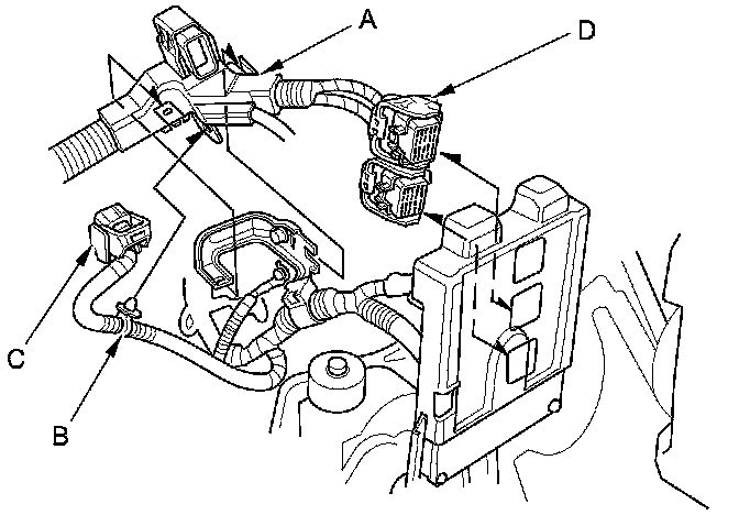 46. Connect the engine wire harness connector (C) and the ECM/PCM connectors (D).
