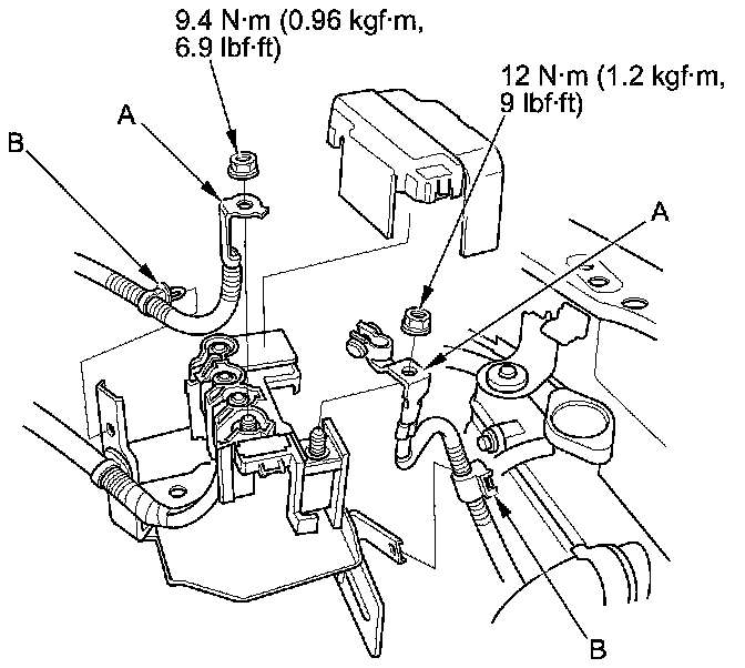 47. M/T model: Install the battery base (A), then install the harness clamp (B).