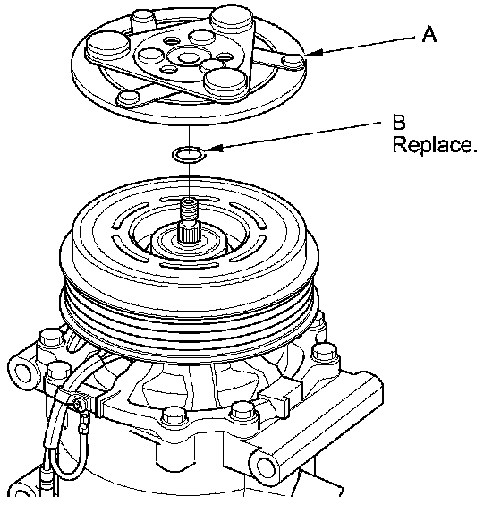 1. Remove the center nut while holding the armature plate (A) with the A/C clutch holder (B).