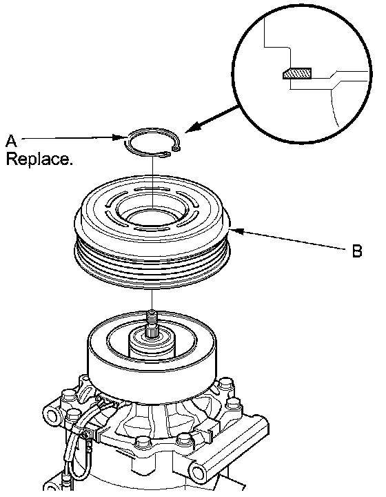 3. If you are replacing the field coil, remove the snap ring (A) with snap ring pliers, then remove the rotor pulley (B). Be careful not to damage the rotor pulley or the A/C compressor.
