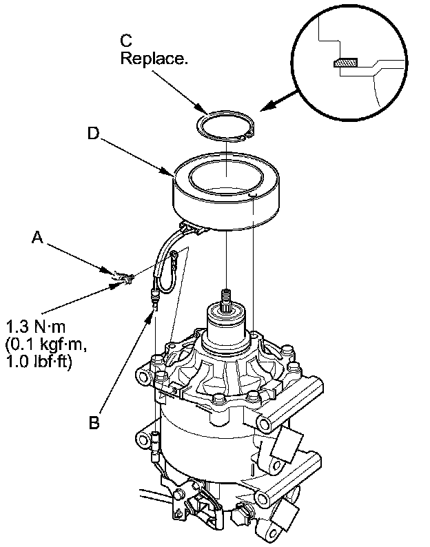 4. Remove the bolt and the holder (A), then disconnect the field coil connector (B). Remove the snap ring (C) with snap ring pliers, then remove the field coil (D). Be careful not to damage the field coil or the A/C compressor.