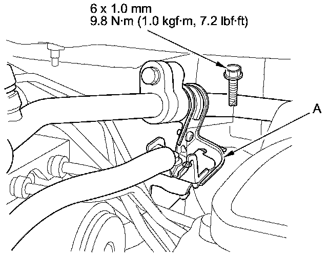 2. Remove the bolt from the A/C line clamp (A).