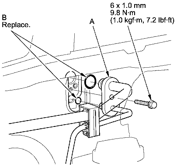 4. Remove the bolt, then disconnect the A/C line (A) from the evaporator core and remove the O-rings (B).