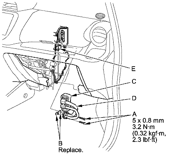 6. Remove the bolts (A), the O-rings (B), the expansion valve (C) and the inlet and outlet lines (D) from the evaporator core (E). Be careful not to bend the lines.