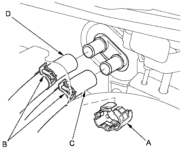 4. From the inlet heater hose, remove the clip (A). Slide the hose clamps (B) back, then disconnect the inlet heater hose (C) and the outlet heater hose (D) from the heater unit. Note the layout of the hoses. Engine coolant will run out when the hoses are disconnected; drain it into a clean drip pan. Be sure not to let coolant spill on the electrical parts or the painted surfaces. If any coolant spills, rinse it off immediately.