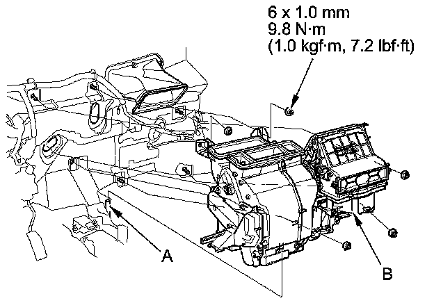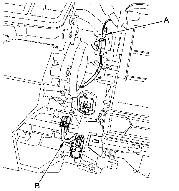 7. Disconnect the connector (A) from the evaporator sensor, and remove the blower resistor wire harness (B).