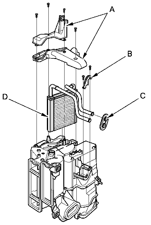 10. Remove the holder (B) and the grommet (C), then carefully pull out the heater core (D).