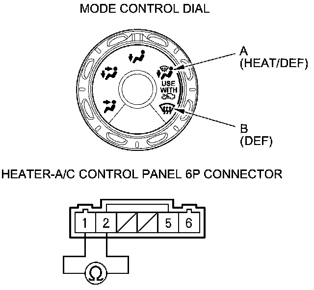 2. Check for continuity between heater-A/C control panel 6P connector terminals No. 1 and No. 2, while rotating the mode control dial from (A) and (B).