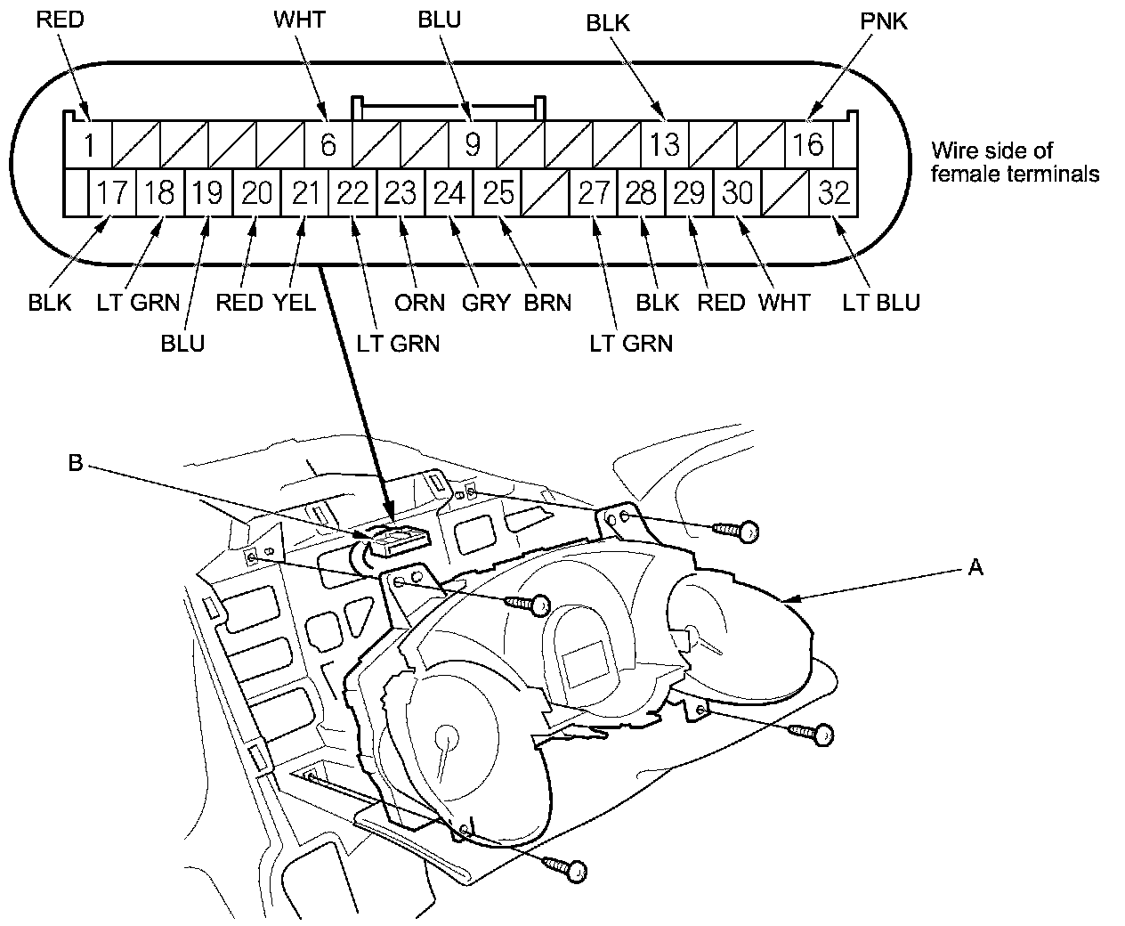 2. Remove the gauge control module (A) Service and Repair, and disconnect the 32P connector (B) from it.