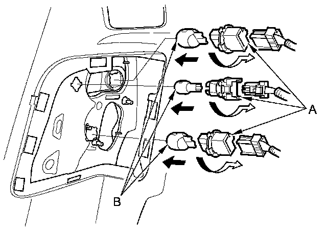 3. Turn the bulb socket (A) 45 ° counterclockwise to remove the bulb (B).