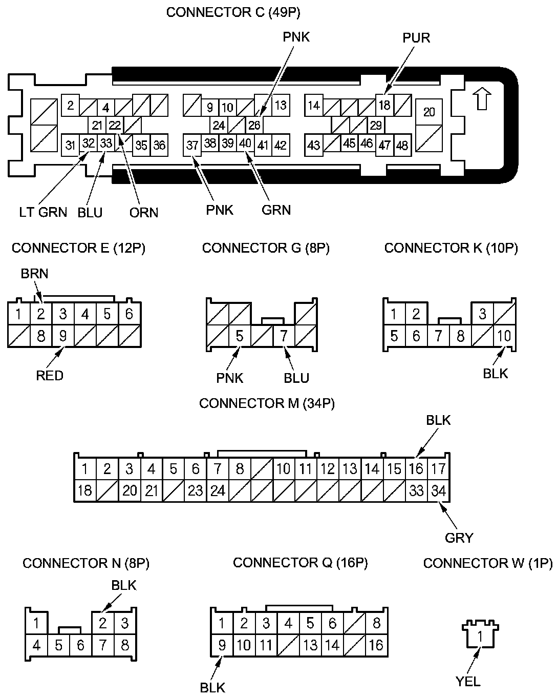 3. Disconnect the under-dash fuse/relay box connectors C, E, G, K, M, N, Q, and W.