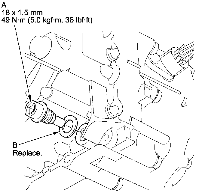 5. Reinstall the drain plug with a new sealing washer (B).