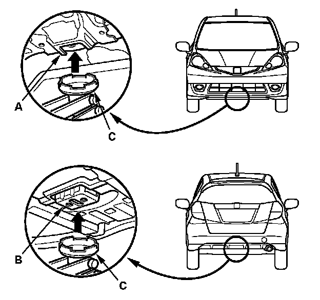 3. Position the floor jack under the front jacking bracket (A) or rear jacking bracket (B). Center the jacking bracket on the jack lift platform (C), and jack up the vehicle high enough to fit the safety stands under it.