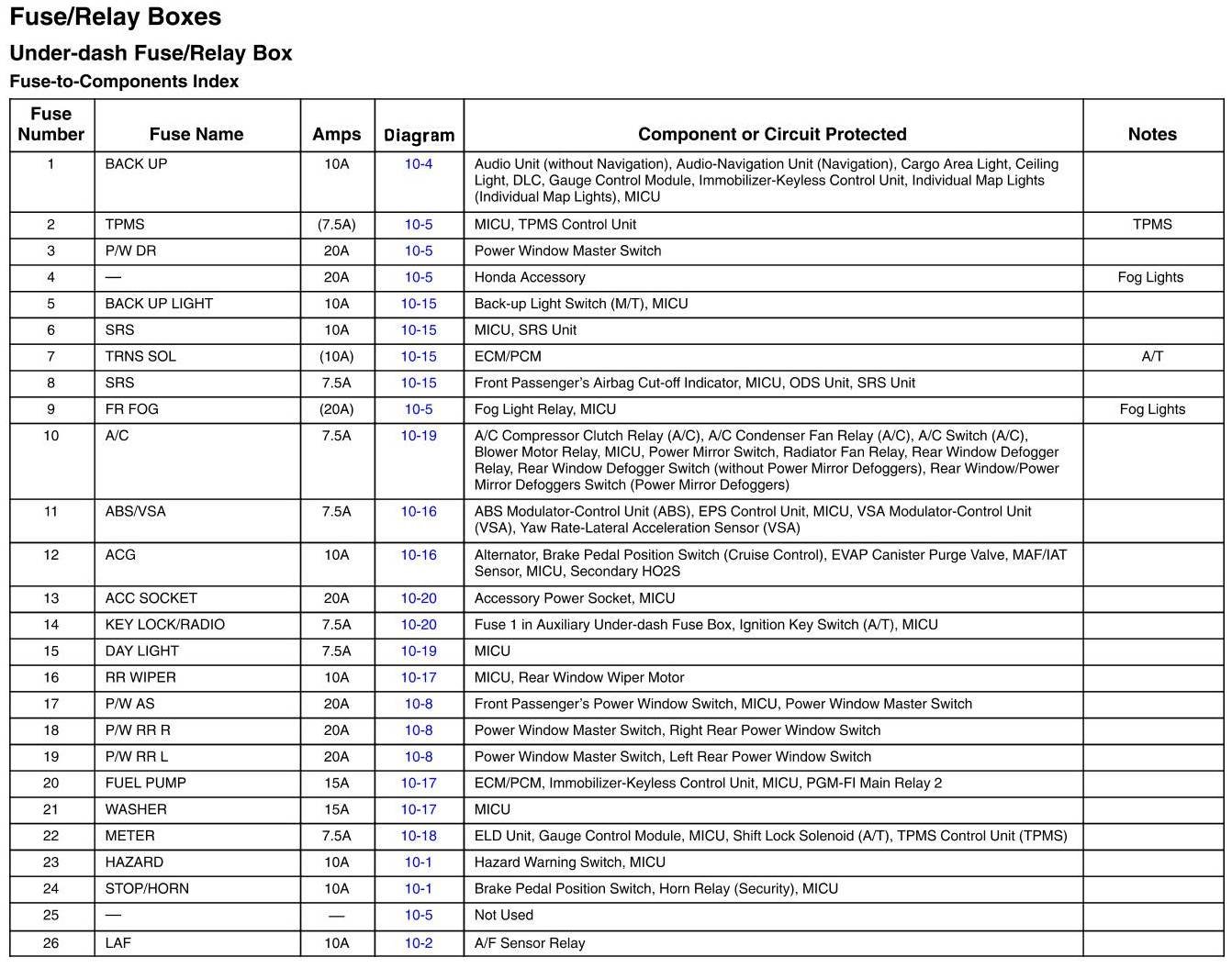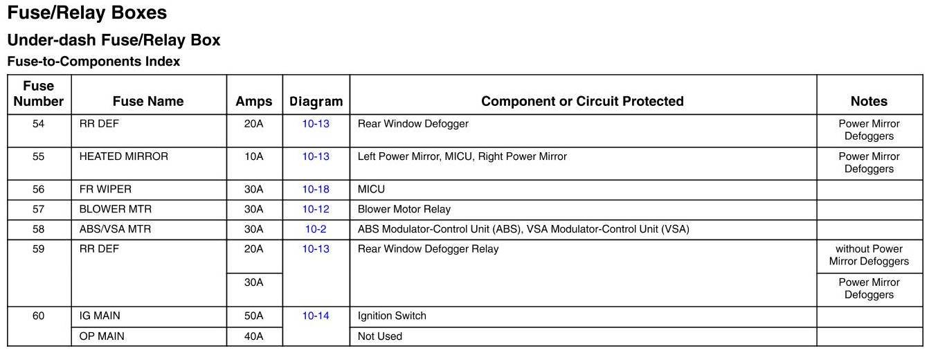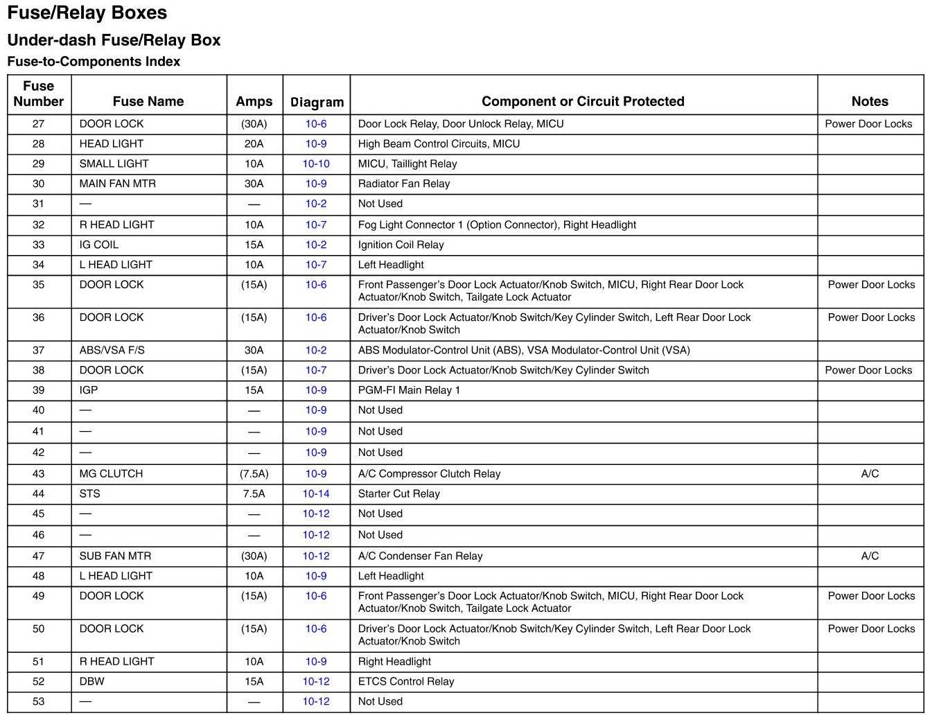 Under-Dash Fuse/Relay Box - Fuse-To-Components Index