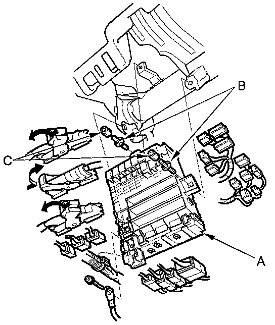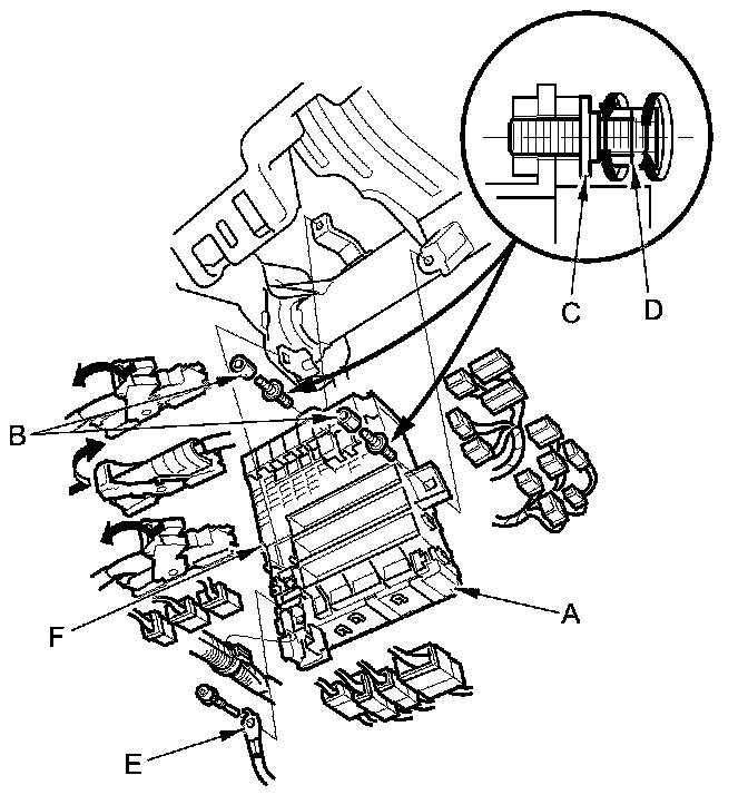 6. Release the lock (F) and pull the fuse/relay box away from the body.