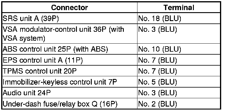 Repair a short in the wire between the DLC (K-line) and the ABS modulator-control unit (with ABS), the VSA modulator-control unit (with VSA system), the SRS unit, the EPS control unit, the TPMS control unit, the immobilizer-keyless control unit, the audio unit, or the under-dash fuse/relay box.�