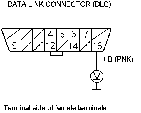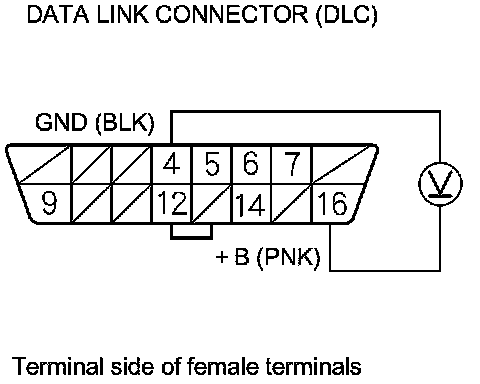 28. Measure the voltage between DLC terminal No. 16 and body ground.