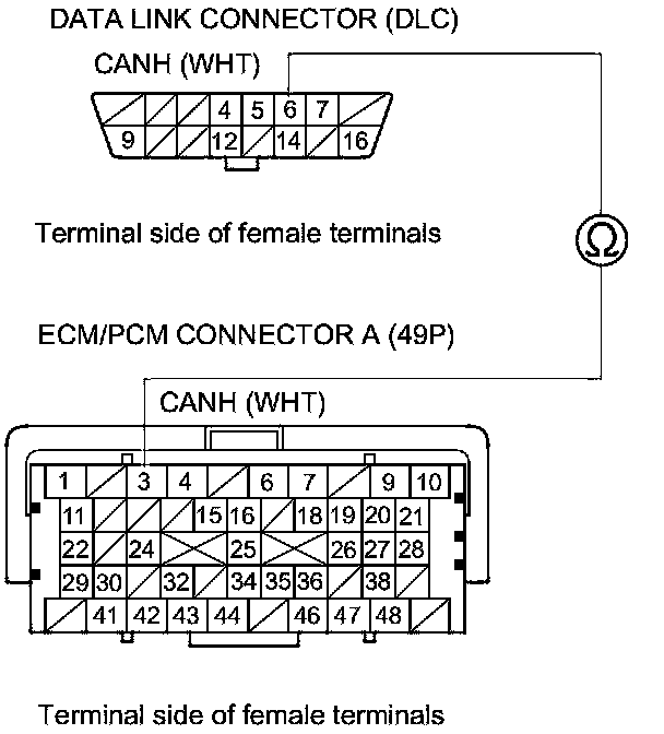 34. Check for continuity between ECM/PCM connector terminal A3 and DLC terminal No. 6.