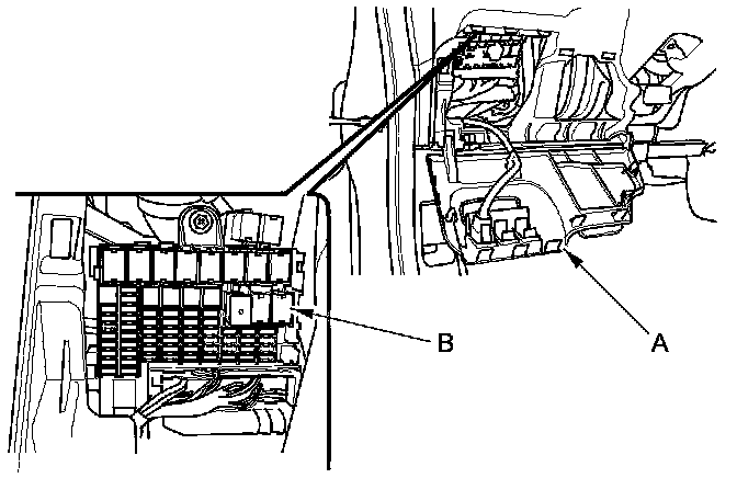 48. Open the fuse access panel (A), then remove PGM-FI main relay 2 (B) from the under-dash fuse/relay box.