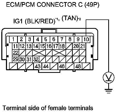 59. Measure the voltage between ECM/PCM connector terminal C10 and body ground.