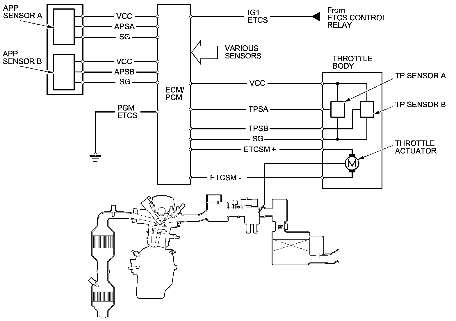 The electronic throttle control system consists of the throttle actuator, TP sensor A/B, the APP sensor A/B, the ETCS control relay, and the ECM/PCM.