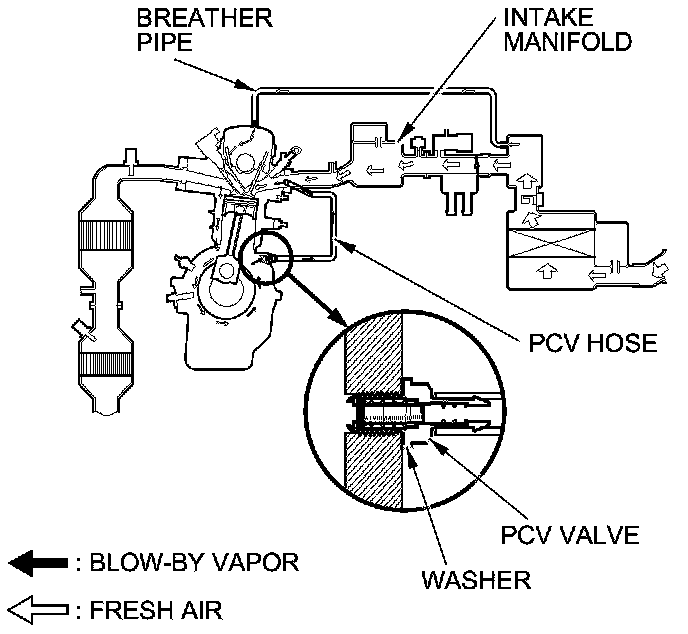 The PCV valve prevents blow-by gasses from escaping into the atmosphere by venting them into the intake manifold.