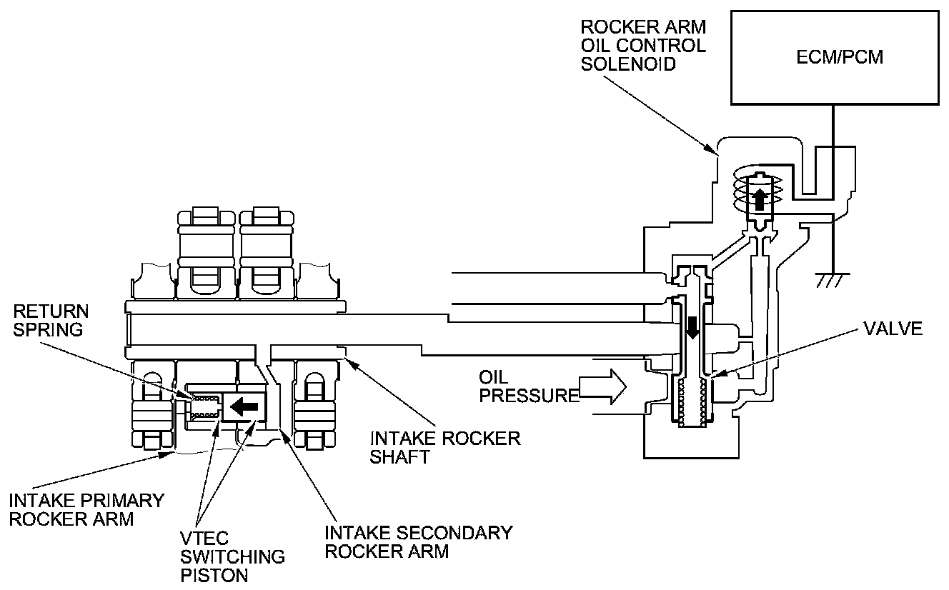 At high engine speed, the rocker arm oil control solenoid is turned on by the ECM/PCM. Oil pressure from the rocker arm oil control solenoid enters into the intake secondary rocker arm via the intake rocker shaft, and it moves the VTEC switching piston in the rocker arm. This causes the VTEC switching piston to slide into the intake primary rocker arm, locking the intake primary and secondary rocker arms together. Both intake rocker arms are lifted by the high lift cam lobe.