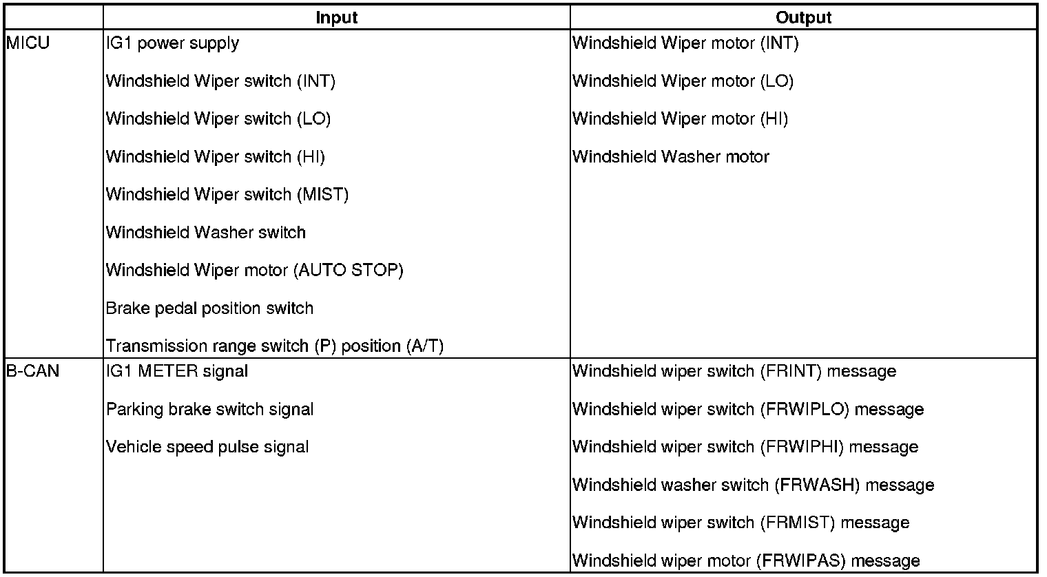 The MICU control of the windshield wiper motor and windshield washer motor is based on input signals from each switch and B-CAN signals.
