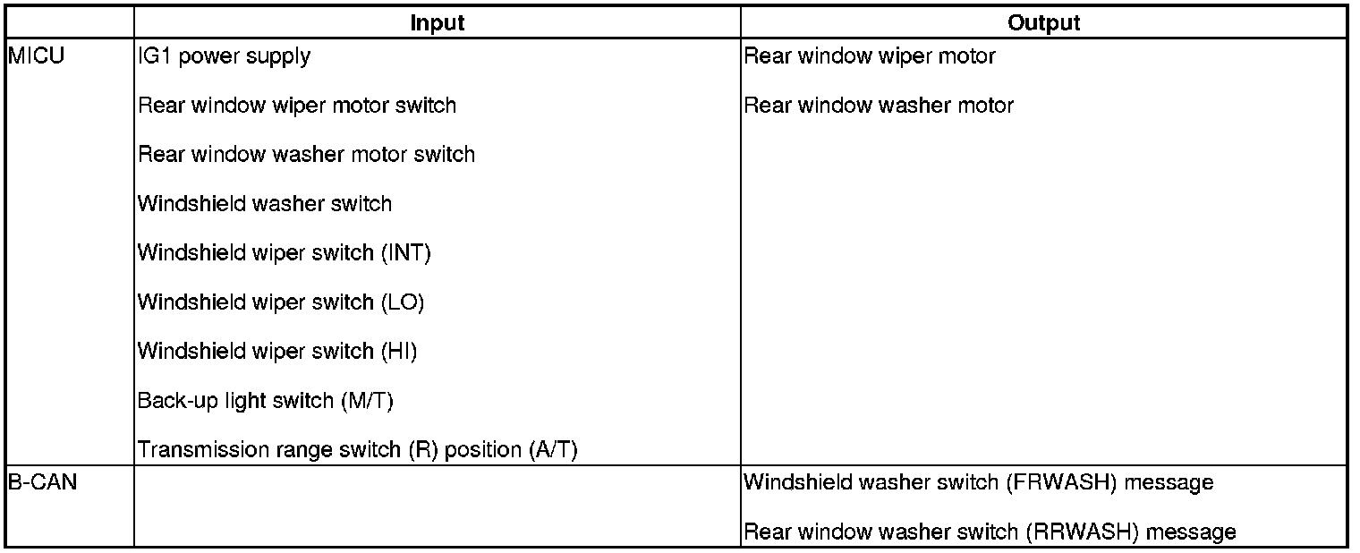 The MICU control of the rear window wiper motor and rear window washer motor is based on inputs from each switch.