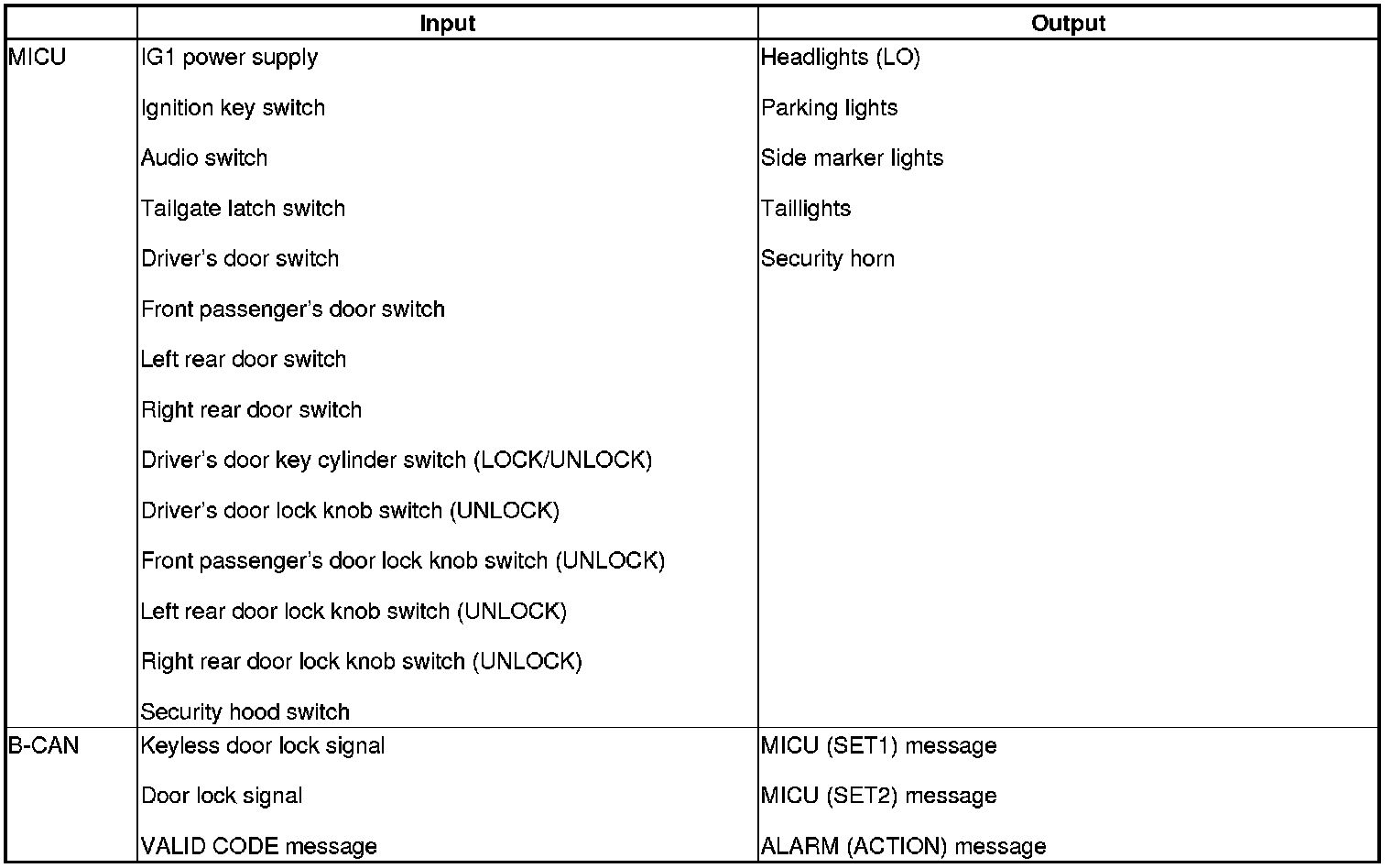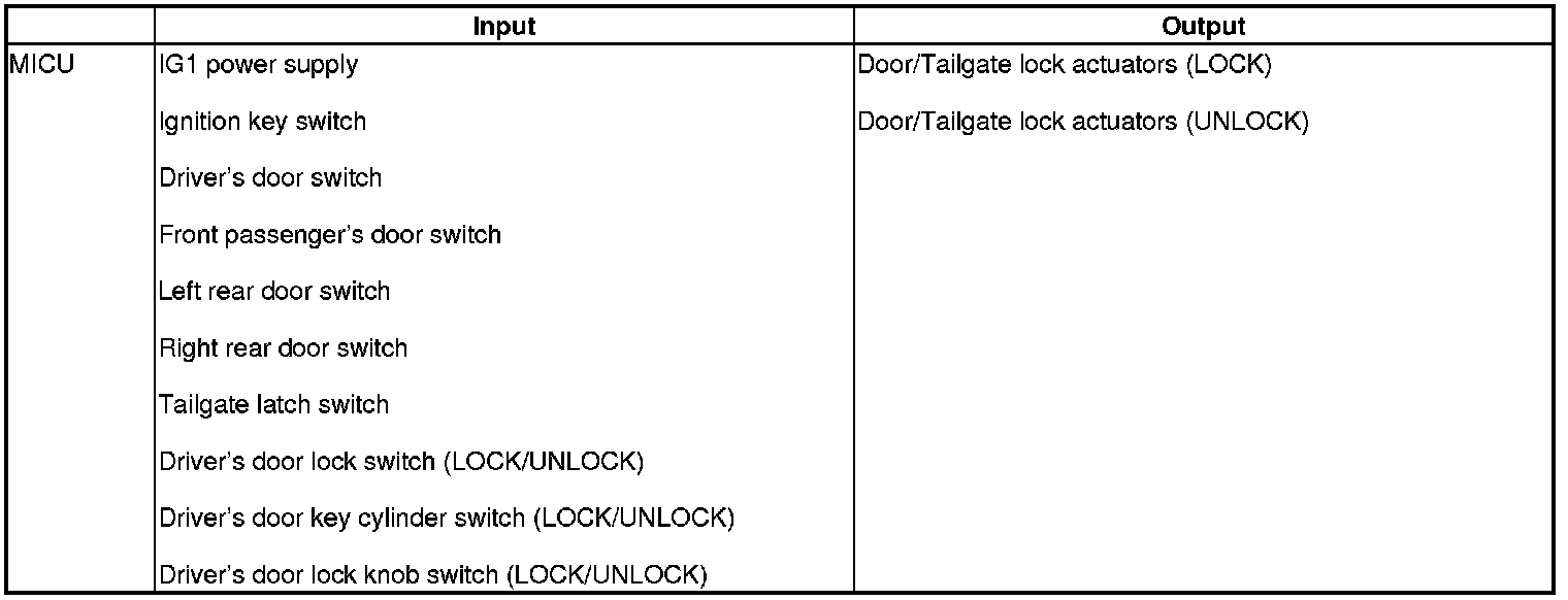 The MICU control of the door lock actuators is based on inputs from each switch and B-CAN data.