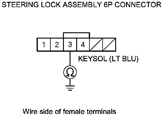 11. Check for continuity between under-dash fuse/relay box connector M (34P) terminal No. 17 and steering lock 6P connector terminal No. 3.