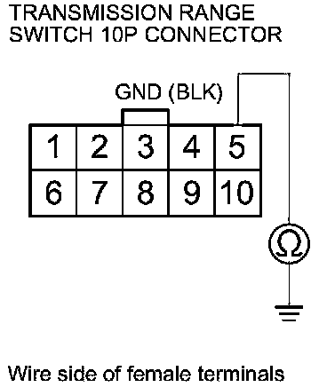 22. Check for continuity between transmission range switch 10P connector terminal No. 5 and body ground.